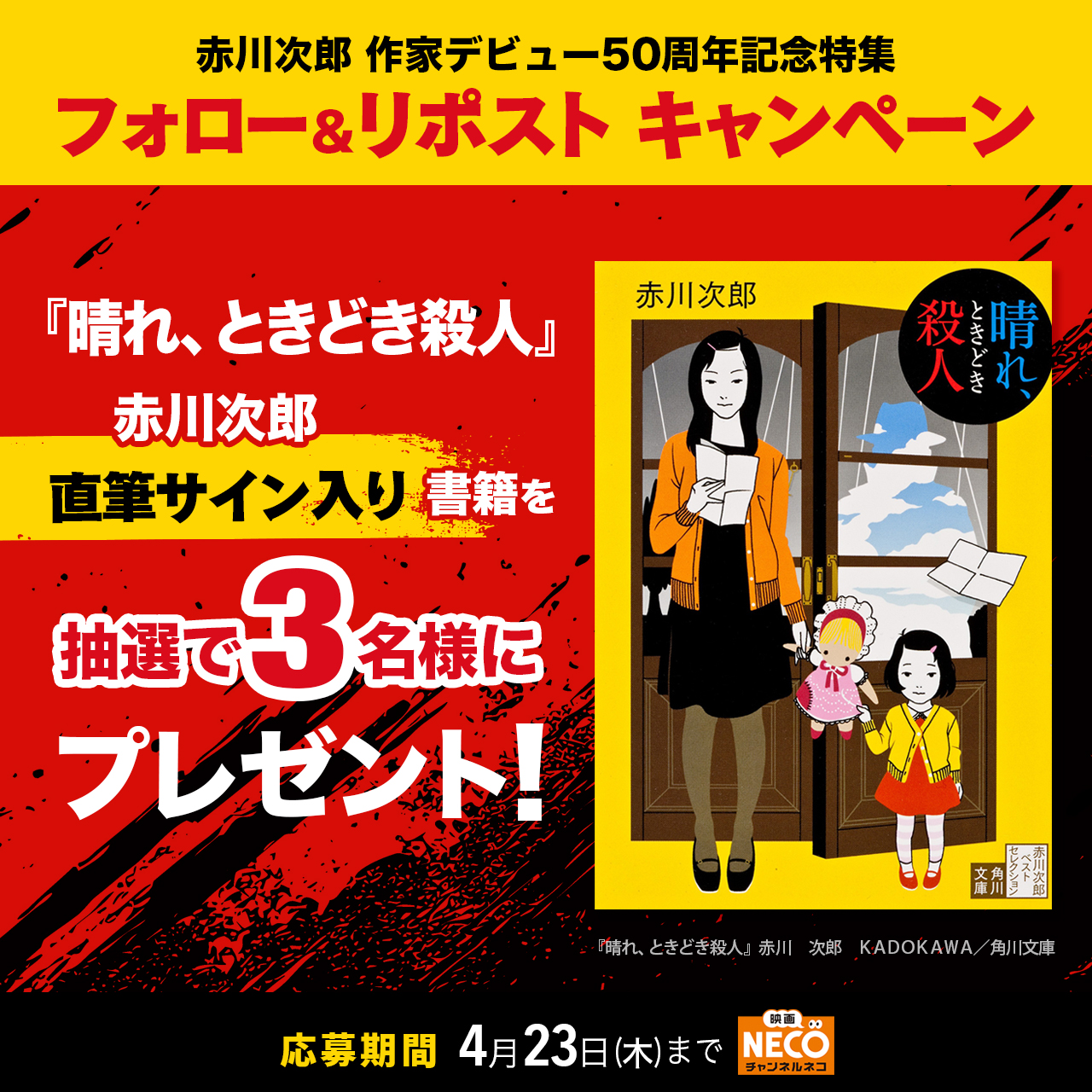 さらに!放送を記念して、「『晴れ、ときどき殺人』赤川次郎直筆サイン入り書籍」が抽選で3名様に当たるXキャンペーンを実施!