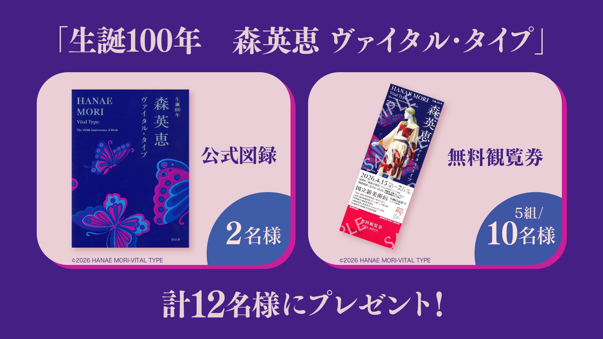 さらに!特集放送を記念して、「生誕100年 森英恵 ヴァイタル・タイプ」の「無料観覧券」や「公式図録」が抽選で計12名様に当たるキャンペーンを実施!
